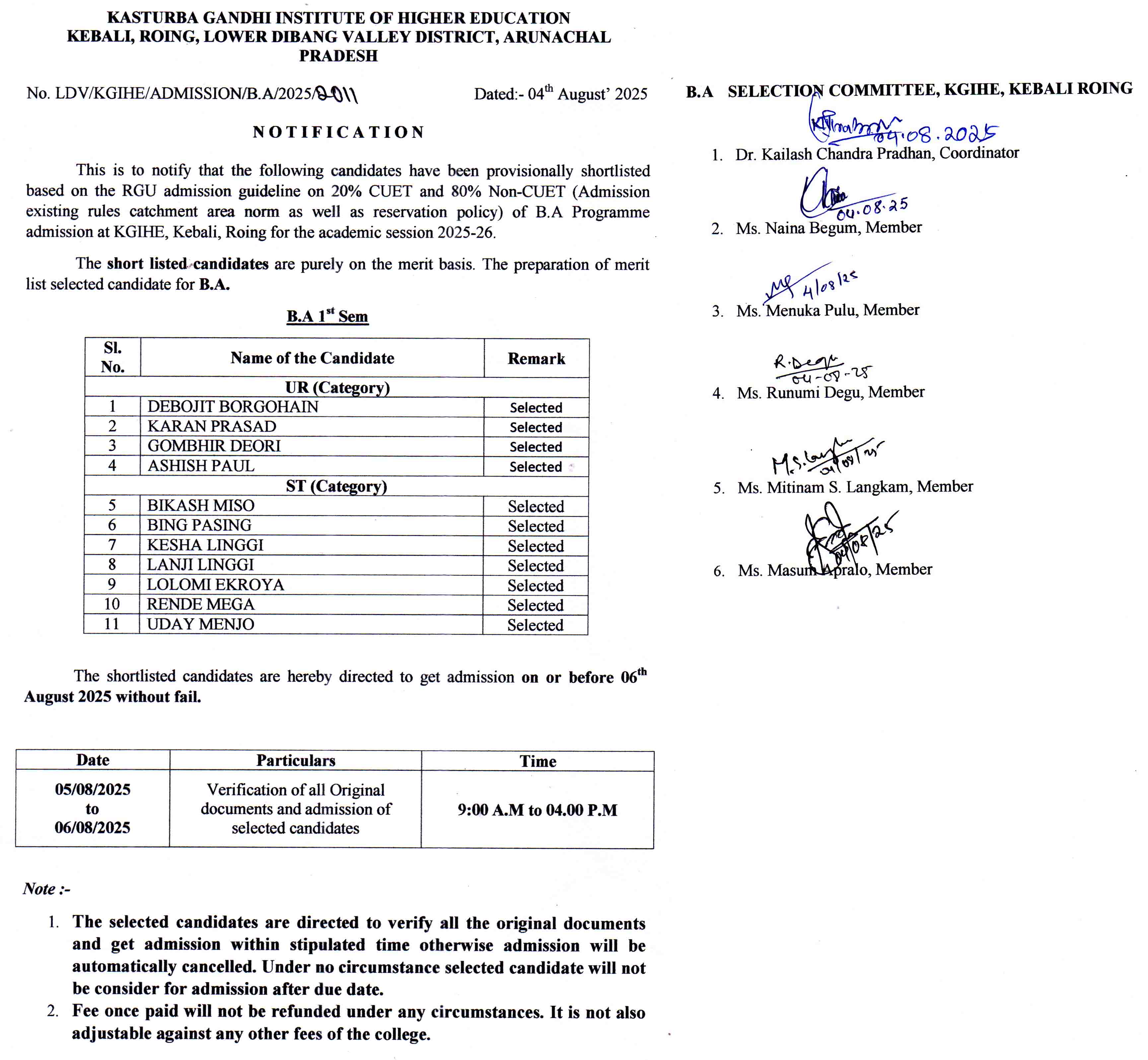 Provisionally selected candidates for B.A (Session 2025-26)